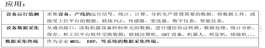 1、  采集:運行狀態(啟動、運行、待機、停機、故障、試機);產量;工藝參數(轉速、時間、壓力、溫度、流量、位移、振動);能耗(用電參數及電能消耗,汽、氣、水消耗);