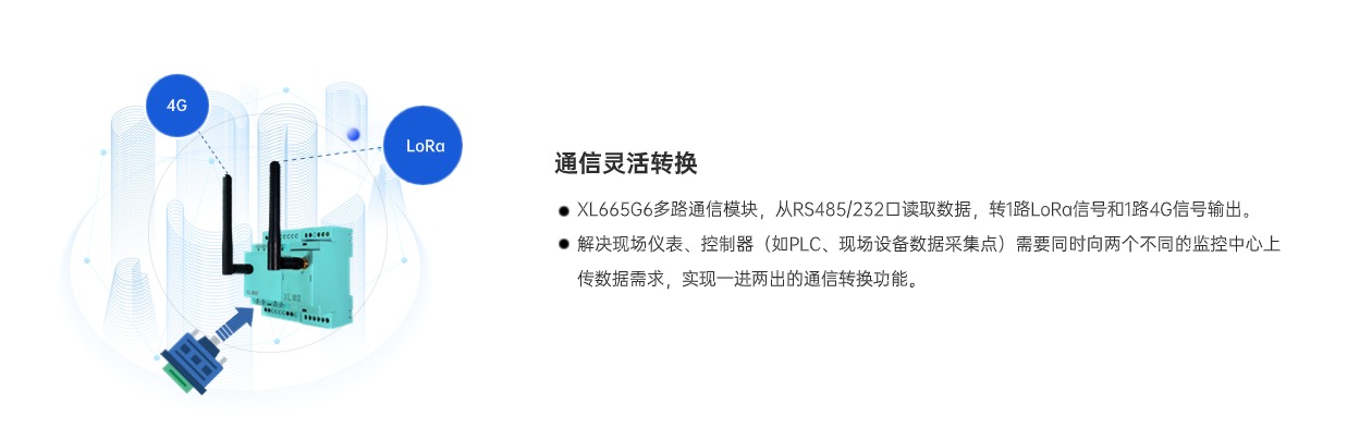 XL665G6多路通信模塊是一款高效靈活的通信轉(zhuǎn)換設(shè)備,可將RS485設(shè)備的一路輸出信號(hào),轉(zhuǎn)為1路LoRa輸出信號(hào)和1路4G輸出信號(hào),有效滿足了工控設(shè)備同時(shí)將數(shù)據(jù)接入兩個(gè)Modbus主站的需求,簡(jiǎn)單、方便、易用,成本更低,滿足多種場(chǎng)景需求。