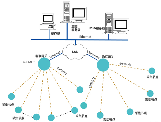 采集節(jié)點,通過490MHz無線上傳數(shù)據(jù)至物聯(lián)網(wǎng)關(guān),網(wǎng)關(guān)通過Ethernet,接入LAN,推送數(shù)據(jù)至MES服務(wù)器
