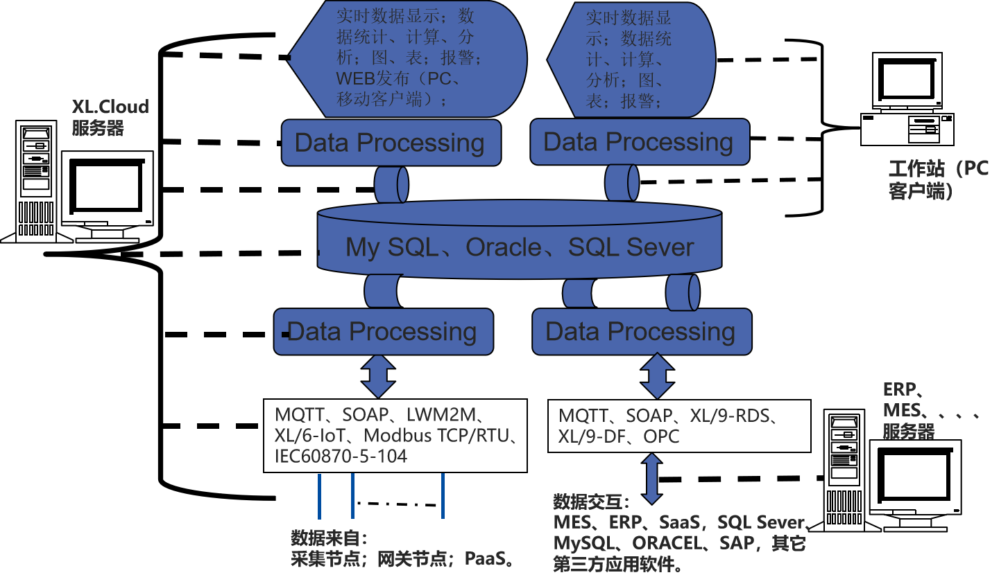 支持MQTT、SOAP,XL/6-IoT、XL/9-DB、XL/9-RDS,等等通信協議,并可和第三方數據庫,Oracle、SAP等交換數據;