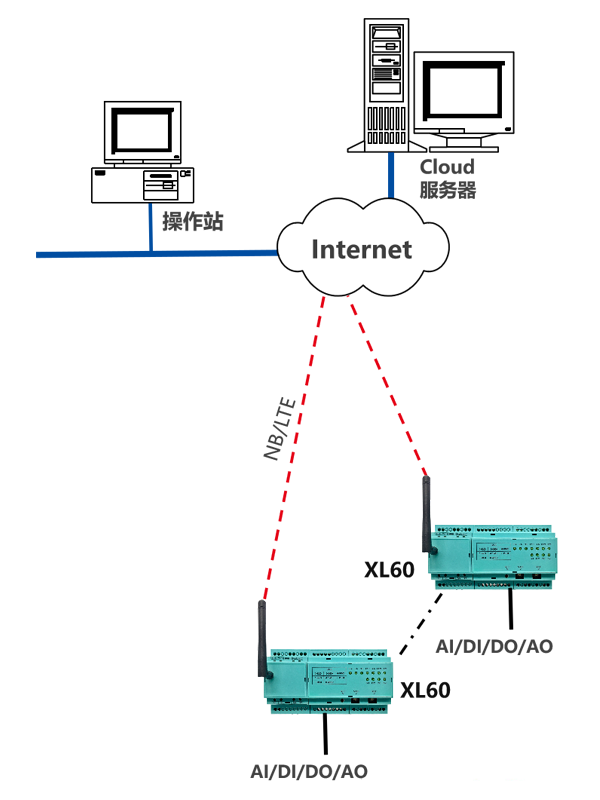 平臺通過無線通信,下發控制指令給XL60主機,主機通過XBUS總線,發控制指令至I/O模塊,相應的模塊輸出開關信號或模擬信號;