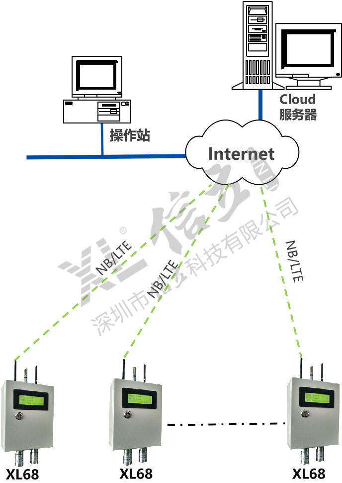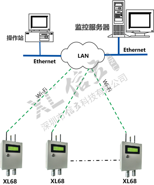 如增加現(xiàn)場(chǎng)集中監(jiān)控點(diǎn),可配置XL97網(wǎng)關(guān)終端,讀取區(qū)域內(nèi)XL68上傳的數(shù)據(jù),分析處理、顯示、報(bào)警,并轉(zhuǎn)發(fā)至監(jiān)控中心服務(wù)器。