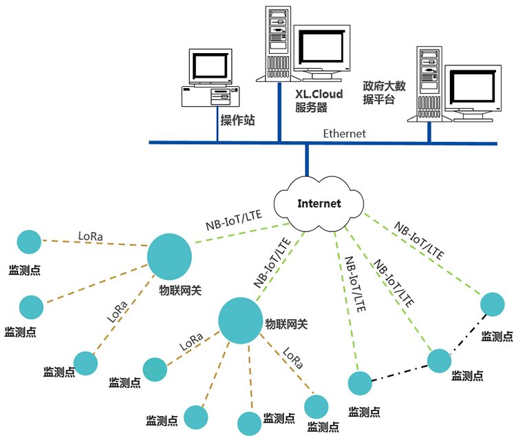 在一個監測點位置,需要監測多種環境參數,建議選擇XL68環境監測終端,同時采集多種環境參數,通過4G/NB推送至監控平臺;(也可選擇通過LoRa上傳到網關終端);