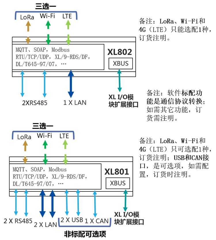 對采集點數(shù)據(jù)量小,需要Ethernet、RS485、CAN、USB 等通信接口讀取數(shù)據(jù),要聯(lián)接多臺設備,選擇XL80智能主機,配置LoRa通信。
