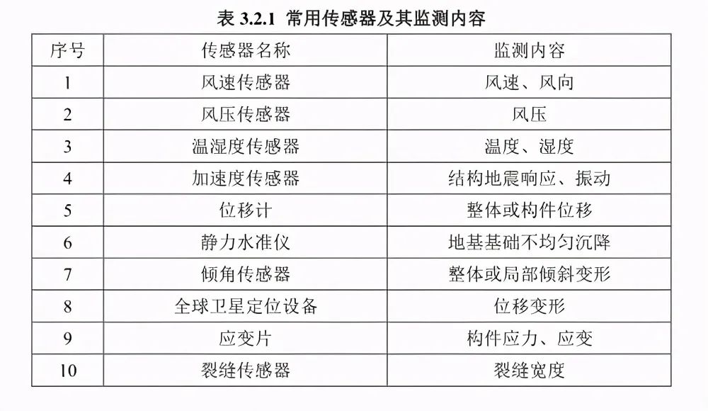 作為結(jié)構(gòu)檢測(cè)最為重要的內(nèi)容,傳感器起到了最為關(guān)鍵的作用。從結(jié)構(gòu)檢測(cè)常用的傳感器類型來(lái)看,風(fēng)速傳感器、風(fēng)壓傳感器、溫濕度傳感器、加速度傳感器、位移計(jì)、裂縫傳感器這些都是必備的,常用的傳感器及監(jiān)測(cè)指標(biāo)見下圖。