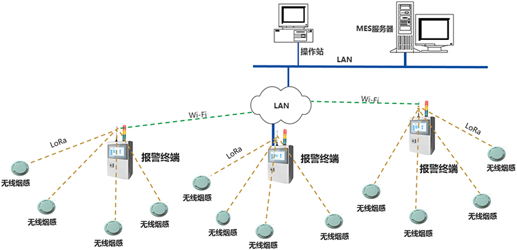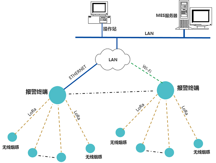 報(bào)警終端通過(guò)無(wú)線,獲取管轄區(qū)域內(nèi),煙感監(jiān)測(cè)點(diǎn)的數(shù)據(jù),通過(guò)ETHERNET,或Wi-Fi,推送數(shù)據(jù)至工廠MES服務(wù)器,通信協(xié)議為工廠MQTT數(shù)據(jù)格式。