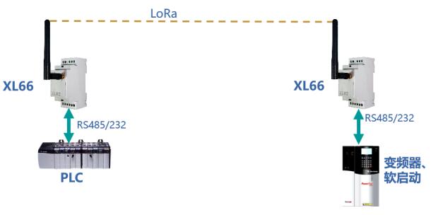 對(duì)于任意2臺(tái)帶RS485、232通信接口的設(shè)備,可分別與一臺(tái)XL66通過(guò)其RS485、232通信接口連接,其數(shù)據(jù)通過(guò)這2兩臺(tái)XL66,以無(wú)線通信方式實(shí)現(xiàn)數(shù)據(jù)透?jìng)鳎瑥亩馊ガF(xiàn)場(chǎng)繁雜的施工布線。