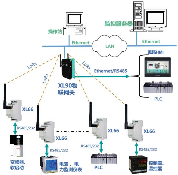 帶RS485或232通信接口的控制器、二次儀表、變送器等設(shè)備,通過(guò)通信接口與XL66連接,XL66通過(guò)LoRa無(wú)線通信方式將數(shù)據(jù)上傳至XL90或XL95物聯(lián)網(wǎng)關(guān),網(wǎng)關(guān)通過(guò)以太網(wǎng)或RS485,上傳數(shù)據(jù)至監(jiān)控平臺(tái)、PLC、觸摸屏、控制器等設(shè)備。從而實(shí)現(xiàn)有線串口設(shè)備的無(wú)線聯(lián)網(wǎng)。