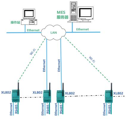 數據聯網:XL80通信主機從設備通信接口讀取設備或系統的運行數據,通信協議轉換處理后,再通過Ethernet或Wi-Fi,接入企業LAN,轉發數據至MES或監控平臺。