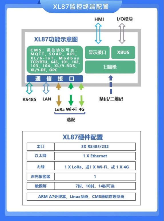 XL87監(jiān)控終端,以一套生產(chǎn)設(shè)備、一條產(chǎn)線、或是多臺(tái)相關(guān)聯(lián)的機(jī)器設(shè)備作為一個(gè)監(jiān)測(cè)對(duì)象,可實(shí)現(xiàn)設(shè)備數(shù)據(jù)采集、運(yùn)行狀態(tài)監(jiān)測(cè)、物料追溯、設(shè)備信息讀取、機(jī)器啟停控制等功能。