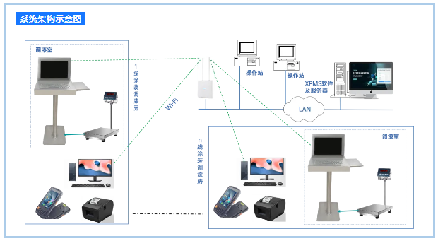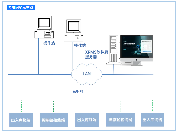信立智能調(diào)漆系統(tǒng)XPMS由服務(wù)器及平臺(tái)軟件、調(diào)漆終端、出入庫(kù)終端、Wi-Fi網(wǎng)絡(luò)構(gòu)成。