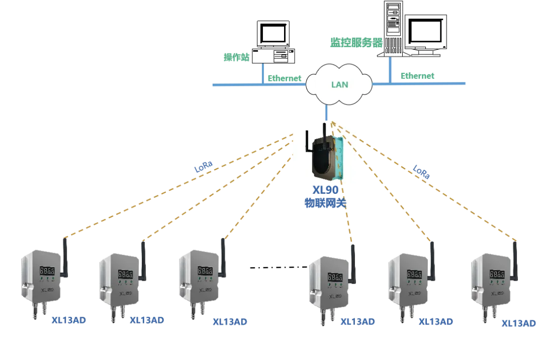 XL13AD無線壓差傳感器通過LoRa無線傳輸數據至XL906物聯網關,網關可選EthernetWi-Fi4G等多種方式將壓差數據傳輸至監控平臺,實現遠程監測。
